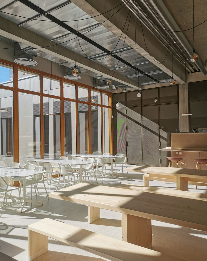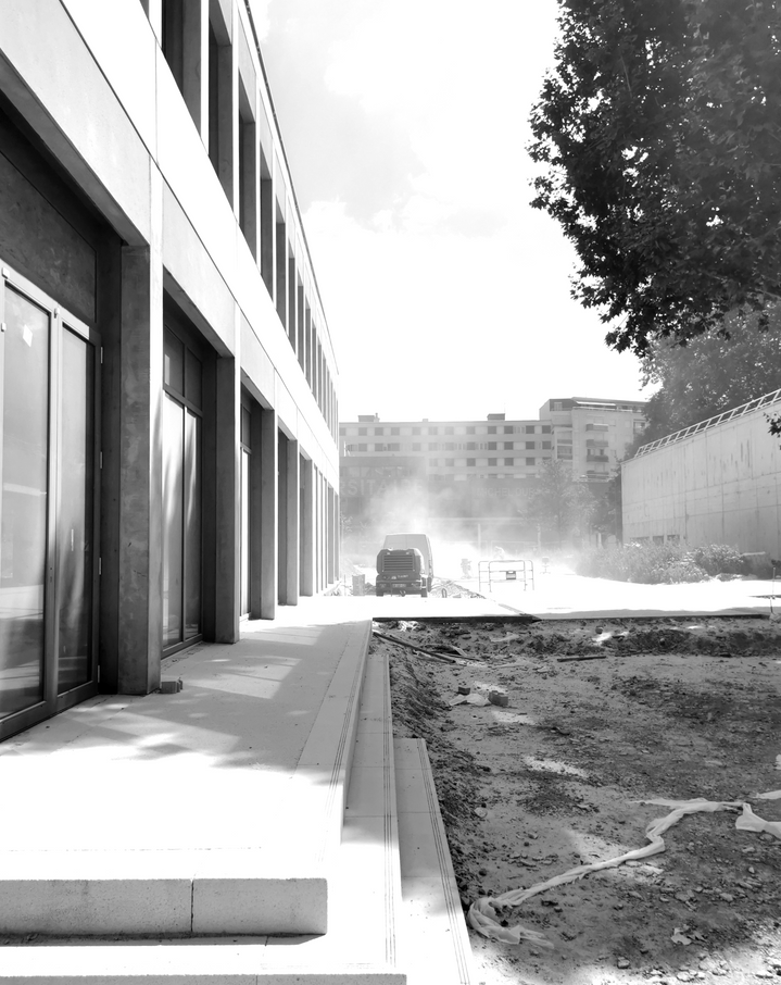 A l'angle de la parcelle, à distance du bâtiment historique, le bâtiment A annonce la nouvelle entrée principale du campus. Le bâtiment K reste ainsi remis, par la posture du nouveau bâtiment de restauration et de cour, à une place centrale qu'il a jadis occupé.