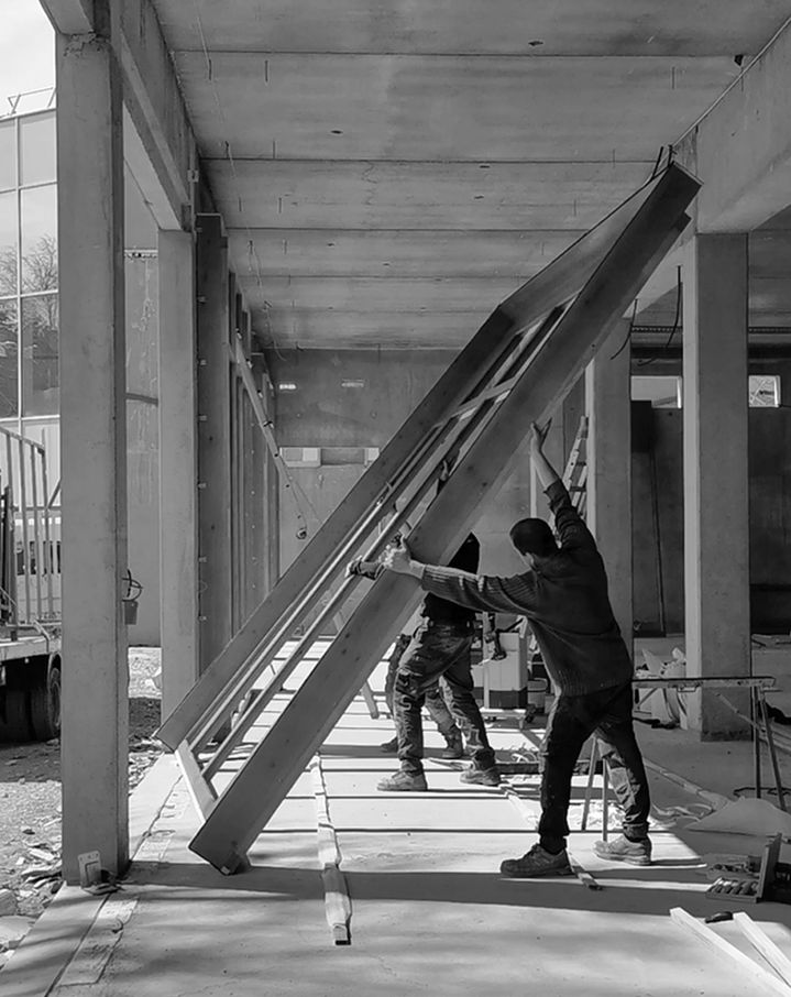 L'espace est composé, par l'emprise au sol du mobilier sur mesure et défini par la structure qui révèle l'effort fait pour permettre la réalisation de cette grande travée.